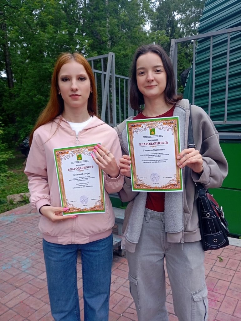 За активную волонтерскую работу с библиотекой на празднике Дня молодежи в городском саду Благодарностями главы города О.В.Исмаилова награждены волонтеры культуры Екатерина Смыкало и София Предеина.Обе девушки ученицы третьей школы, Катя выпускница, а Соня окончила 10 классов. Они участвовали в театральных инсценировках студии "Театр книги", помогали при проведении чемпионатов по чтению вслух и других мероприятий, где требовалась их помощь. Поздравляем девушек и желаем исполнения задуманных планов.