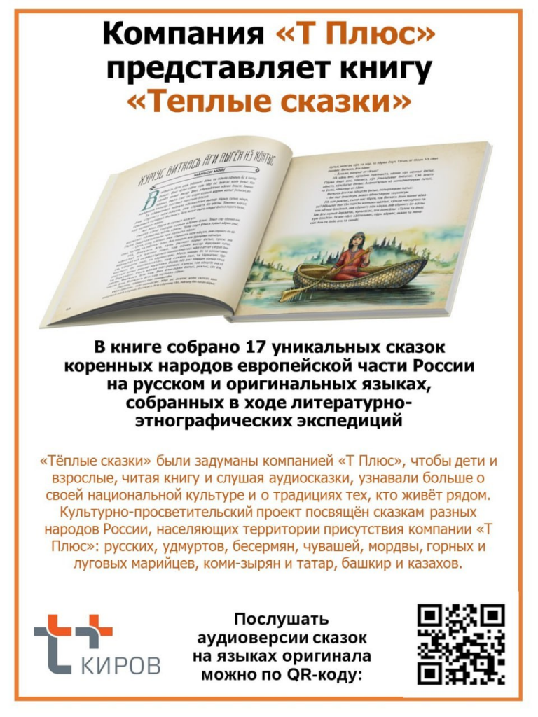 Уважаемые читатели, компания «Т Плюс» выпустила уникальную книгу с ранее не издававшимися сказками малых народов России, в которую вошли 17 сказок коренных и малочисленных народов, проживающих на территории присутствия компании. Каждая сказка изложена в книге на русском и на языке того народа, к которому она относится. На страницах читатель может найти куар-коды, отсканировав которые можно услышать аудиоверсии также на двух языках. Связующей нитью книги стала сквозная сказка, которая проходит через все повествование. Она ведет читателя от одной сказки к другой, увлекая его за собой всё дальше и дальше в мир волшебных историй и их героев.